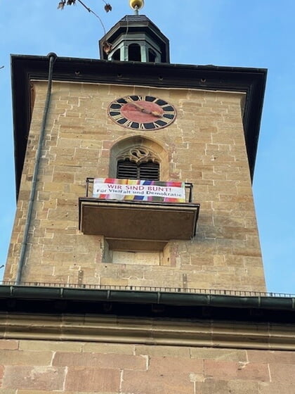 Mit bunten Bändern Farbe bekennen für Demokratie, Rechtsstaatlichkeit und Menschenrechte, für eine offene, solidarische Gesellschaft. Wir wenden uns damit gegen Hass, Hetze und Ausgrenzung in unserer Gesellschaft und setzen ein Zeichen für Vielfalt, Toleranz und Mitmenschlichkeit.