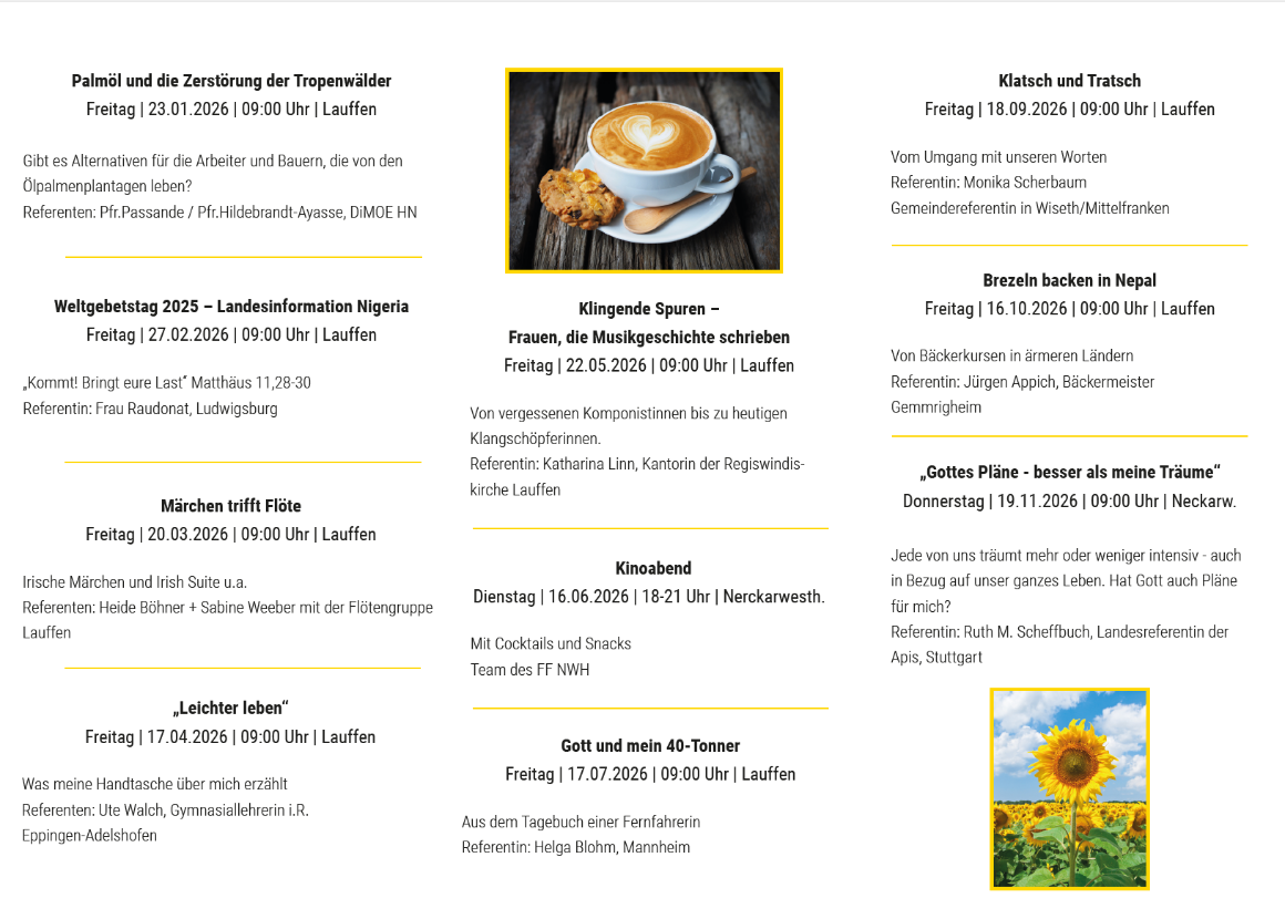 Ansprechpartnerinnen sind Pfarrerin Annette Winckler-Mann, Kirchbergstraße 9, 74348 Lauffen (T. 07133-988 312), Trude Horn in Lauffen (T. 07133-87 10) und Pia Kemmsies in Neckarwestheim (T. 07133-123 03). Für das Frühstück bitten wir jeweils um einen Unkostenbeitrag von 7 €.