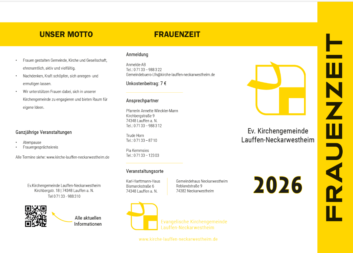 Anmeldung zu den Veranstaltungen ist ca. ab 14 Tage vor dem Termin über den Anmelde-Anrufbeantworter unserer Kirchengemeinde (T. 07133-988 322) oder per Mail an das gemeindebuero-lfn@kirche-lauffen-neckarwestheim.de möglich.